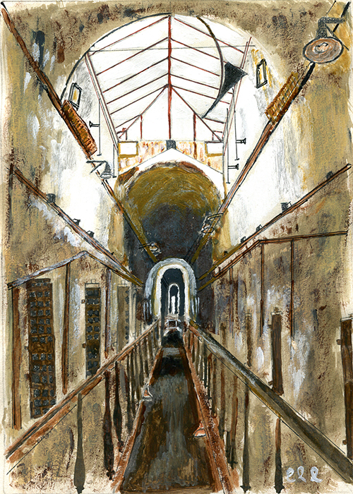 Eastern State Pen. Watercolor, Ink Pen, & Acrylic; from Postcard of America's Most Historic Prison.