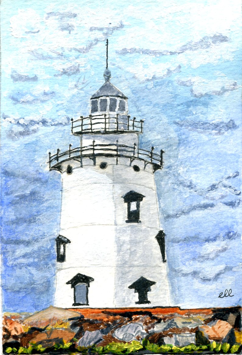 Old Saybrooke Lighthouse, CT. Watercolor, Acrylic, Pen & Ink and Pencil, from photo postcard.